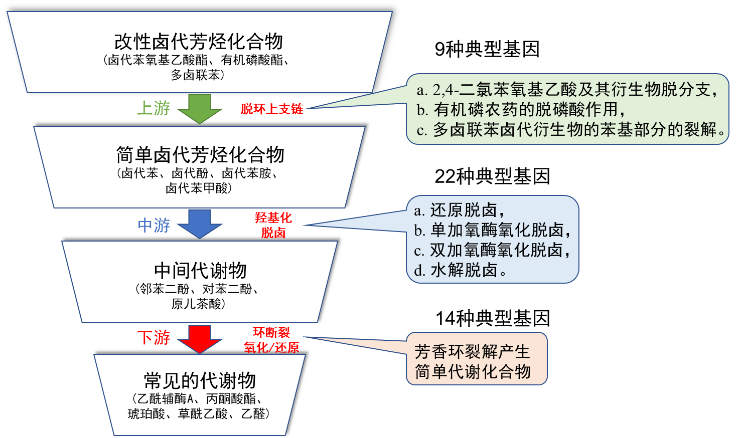 附件4-5系在深圳市茅洲河、大沙河流域的底泥宏基因组数据中,新发现了895条微生物的卤代芳烃降解基因,包括第一阶段267条,第二阶段430条和第三阶段198条。这些微生物的卤代芳烃降解过程可分为三个主要步骤:上、中、下代谢途径,依次将有毒的卤代芳烃转化为细胞内的常见代谢物。相关研究已发表在International Biodeterioration & Biodegradation(Zou et al. 2024;https://doi.org/10.1016/j.ibiod.2024.105806)。