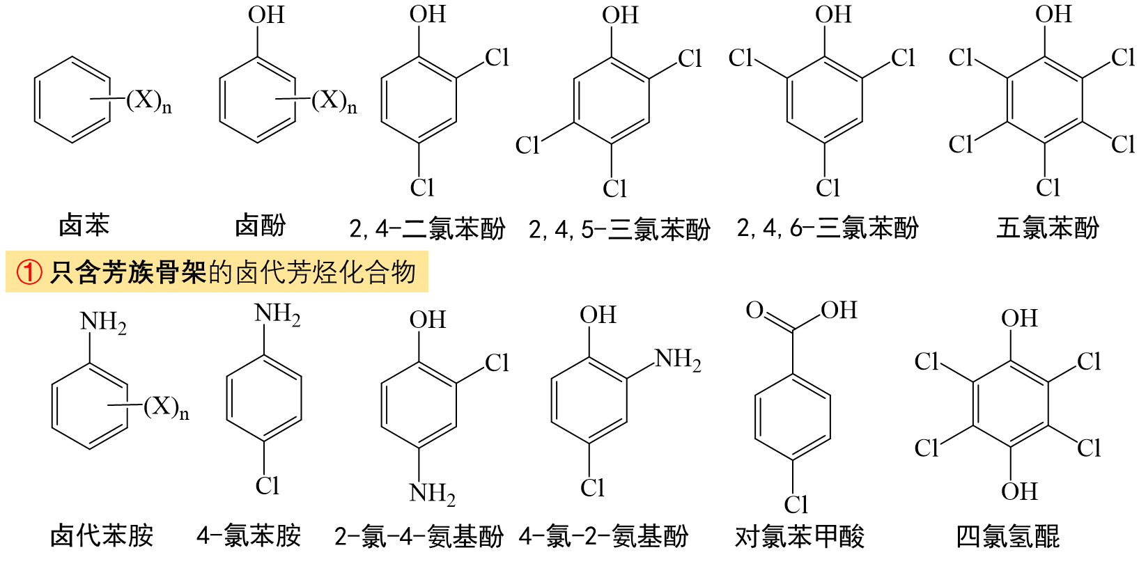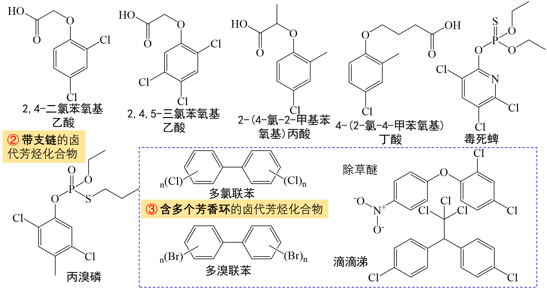 卤代芳烃是一种携带有卤族原子的芳香族化合物的总称,根据它们结构复杂度的不同,可以被分为三类:第一类是结构最为简单的卤代芳烃化合物,只包含了一副芳香环骨架和至多一个非卤取代基,例如氯苯、氯酚等(图1);第二类则具有一个或多个结构较为复杂的取代基,相对于第一类卤代芳烃化合物,不仅具有较高的生物毒性,也具有较强的化学稳定性,例如除草剂四氯丁酸、农药毒死蜱等(图2);第三类是具有多于一个芳香环骨架的化合物的集合,包含了常见的多氯联苯(PCBs)、多溴联苯醚(PBDEs)等工业用品和滴滴涕(DDT)、除草醚等农业用品(图2)。它们大部分都被列入国家环保局的《中国水中优先控制污染物黑名单》。研究表明,环境中存在大量可降解卤代芳烃的微生物类群,包括细菌(红球菌、假单胞菌、棒杆菌、微球菌、产碱杆菌、分歧杆菌、鞘脂菌、诺卡氏菌等)、真菌(平革菌、侧耳、云芝等)和藻类(阿格门氏藻、颤藻、栅藻和月牙藻等)等。它们对卤代芳烃的降解脱毒代谢可以系统地分为三个阶段(图3):第一个阶段是复杂卤代芳烃取代基的脱支阶段;第二个阶段是卤代芳烃的卤基被取代,并被氧原子激活的阶段;第三个阶段则是芳香环裂解成为脂肪酸类化合物,并进入微生物的物质代谢循环的阶段。