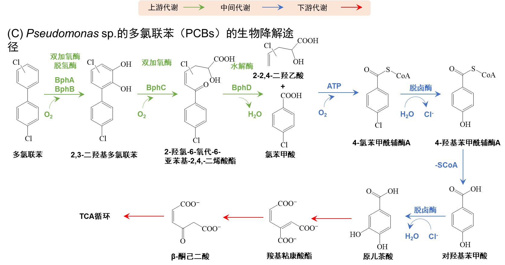 其中第一阶段只存在于微生物对复杂卤代芳烃化合物的代谢过程中,而第三阶段的代谢产物为脂肪酸类化合物,与微生物常见的碳源底物相似,相关过程与微生物的物质代谢循环重叠,因此各个微生物种类的代谢模式极为相似。在第二阶段,由于各类卤代芳烃的性质差异较大,微生物演化出了不同的代谢通路和酶系统对不同的卤代芳烃进行降解和利用,因此显示出了较高的代谢多样性,成为了当前微生物卤代芳烃降解脱毒的研究重点。根据降解过程的化学反应特性,第二阶段的微生物卤代芳烃脱毒代谢可以被分为以下几种模式:(1)卤代芳烃的还原脱卤。微生物的还原脱卤过程是利用氢原子代替卤原子氧化还原过程,是微生物厌氧脱毒的主要过程,微生物以卤原子作为电子受体,氢作为电子供体进行氧化还原反应,而膜结合还原脱卤酶是这个反应的关键酶。(2)卤代芳烃的加氧酶氧化脱卤。加氧酶是一种可以将氧分子导入有机物,并生成一个羟基的酶类,单加氧酶在一个反应中可以生成一个羟基,而双加氧酶可以生成两个羟基。微生物可以利用此类酶将卤代芳烃中的卤基替换成为羟基,是微生物好氧脱毒的主要过程。(3)卤代芳烃的水解脱卤,是将水分子解离出来的羟基替换卤基的反应。该反应目前只在微生物对氯苯乙酸的降解脱毒过程中发现。如图4和5所示,微生物对2,4-D、毒死蜱和多氯联苯降解的途径就是通过三步走的方式进行。