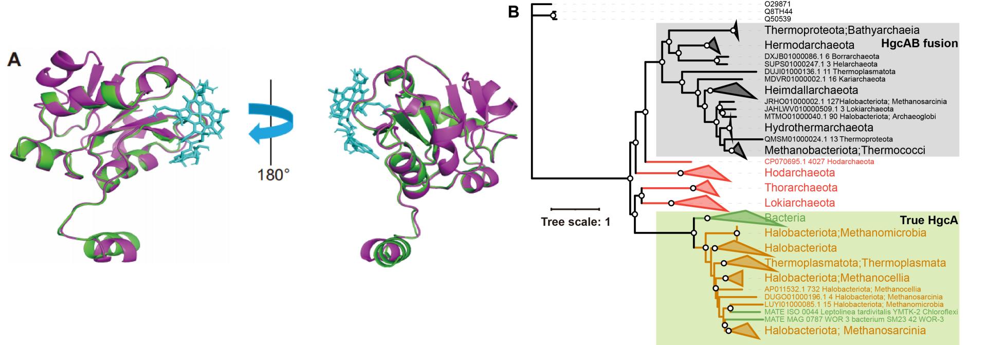 图1:阿斯加德古菌HgcA的蛋白结构预测(A)和系统发育位置(B)