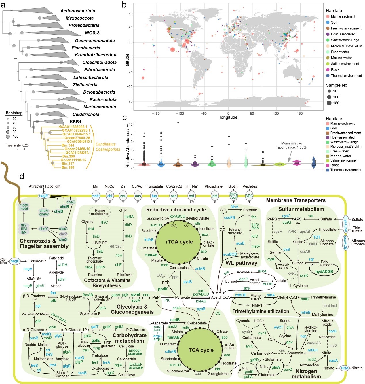图1新门CandidatusCosmopoliota的系统发育分析、全球分布和代谢潜能
