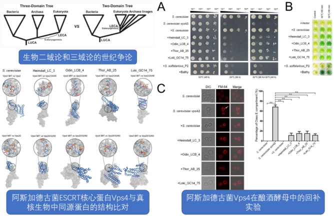 值得一提的是,团队通过对阿斯加德古菌(Asgard archaea)和真核生物的对比研究,在生物二域和三域的世纪争论中发出了来自中国的声音。2018年3月,李猛教授团队受邀发表综述性文章,概览生物二域和三域的争论始末。随后,针对多个古菌基因组的进化研究,为阿斯加德古菌和真核生物在系统发育上的相近地位提供了证据。最近,在阿斯加德古菌基因组中发现了曾被认为仅保守存在于真核生物内膜系统中的关键分子机器—内体分选转运复合体(ESCRT),提示真核生物中的该分子机器起源自古菌,而内膜系统起源自古菌向真核生物的演变过程;团队利用酿酒酵母的体内功能回补实验揭示了阿斯加德古菌ESCRT核心蛋白Vps4与真核生物中同源蛋白在功能和演化中的关联性,为真核生物内膜系统及其关键分子机器起源自古菌提供直接实验证据,在很大程度上论证并完善了生物二域论假说。