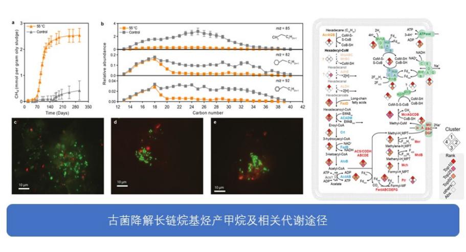 另外,团队与中国农科院沼气科学研究所的承磊研究员和德国不莱梅大学的Gunter Wegener教授合作研究发现一种新型的产甲烷古菌,这种古菌可以直接将复杂烷基烃降解生成甲烷,突破了传统认知,未来有望应用在地下枯竭油藏残余原油的开采中。研究通过对胜利油田样品的长时间富集培养,获得了一类新型的产甲烷古菌(CandidatusMethanoliparum)。通过荧光原位杂交、稳定碳同位素标记培养、宏基因组和宏转录组测序、高分辨质谱等一系列分析结果,证明Ca. Methanoliparum可以直接氧化长链烷基烃,并通过β-氧化、Wood-Ljungdahl途径进入产甲烷代谢,而不需要通过互营代谢来完成。该研究证实了古菌可以独立降解复杂石油烃产甲烷,并提出了一种新的古菌甲烷产生类型,即长链烷烃代谢产甲烷,区别于传统的氢营养型、乙酸还原型和甲基营养型。这项研究成果有望应用在能源领域,通过产甲烷古菌的作用,将枯竭油藏难以开发利用的原油转化为甲烷,进行天然气开采。该成果于2021年发表在Nature期刊。