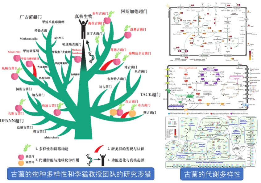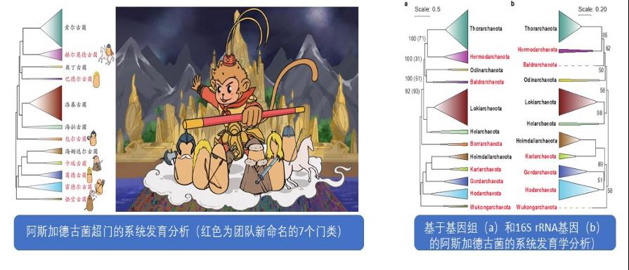 2020年,团队首次在我国红树林湿地沉积物中发现了第六个阿斯加德古菌门—葛德古菌(Gerdarchaeota);随后,团队进一步对现有基因组和不同环境样品的宏基因组进行整合分析,再发现了6个尚未被报道的阿斯加德古菌新门,分别命名为赫尔莫德古菌(Hermodarchaeota)、巴德尔古菌(Baldrarchaeota)、包尔古菌(Borrarchaeota)、卡瑞古菌(Kariarchaeota)、霍德尔古菌(Hodarchaeota),还有一个更为古老的阿斯加德古菌新分支则以中国古典名著《西游记》中大闹天宫的齐天大圣“孙悟空”的名字命名为悟空古菌(Wukongarchaeota),以彰显我国的文化自信。悟空古菌具备氢氧化的化能自养代谢潜能,显著区别于其他阿斯加德古菌混合营养或异养的代谢模式,这也是将其命名为中国神话人物的原因。相关成果分别发表在Nature和Science China Life Sciences期刊。